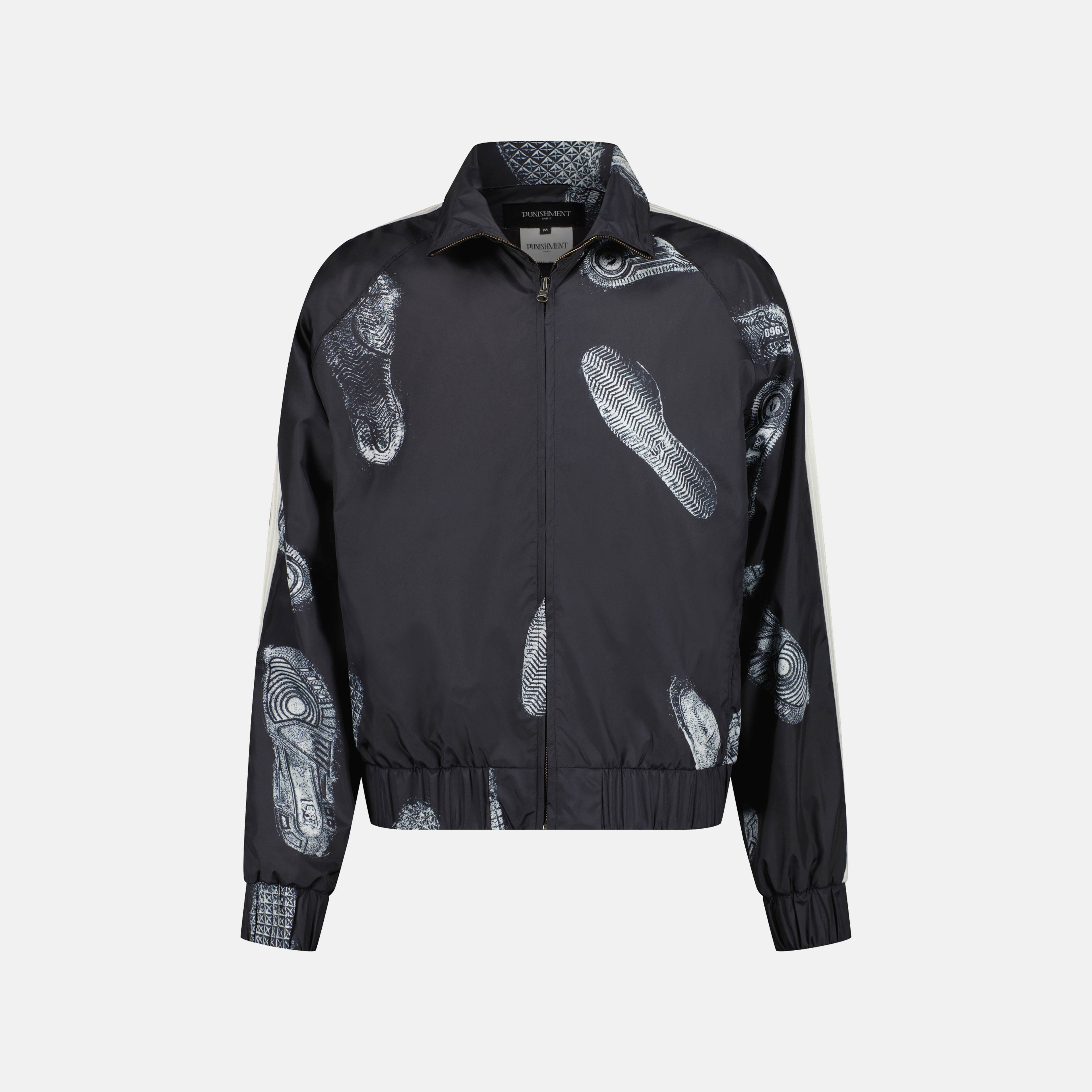 Nylon taffeta track jacket with sneaker sole print, knitted shoulder band, elasticated cuffs and waistband, zip closure, cotton lining, side pockets.