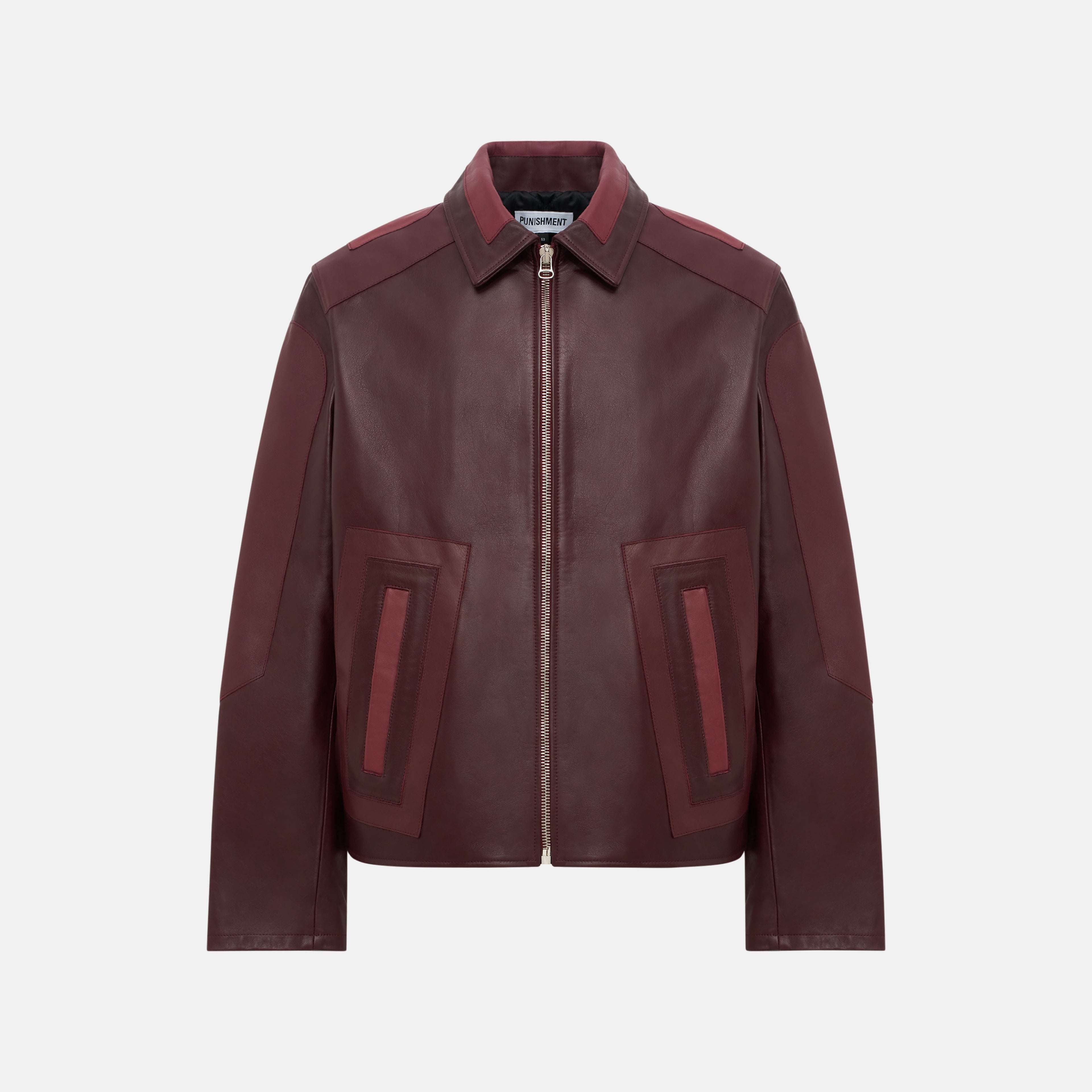 Straight-fitting cowhide leather jacket with burgundy and wine-colored patch effects and quilted lining.
