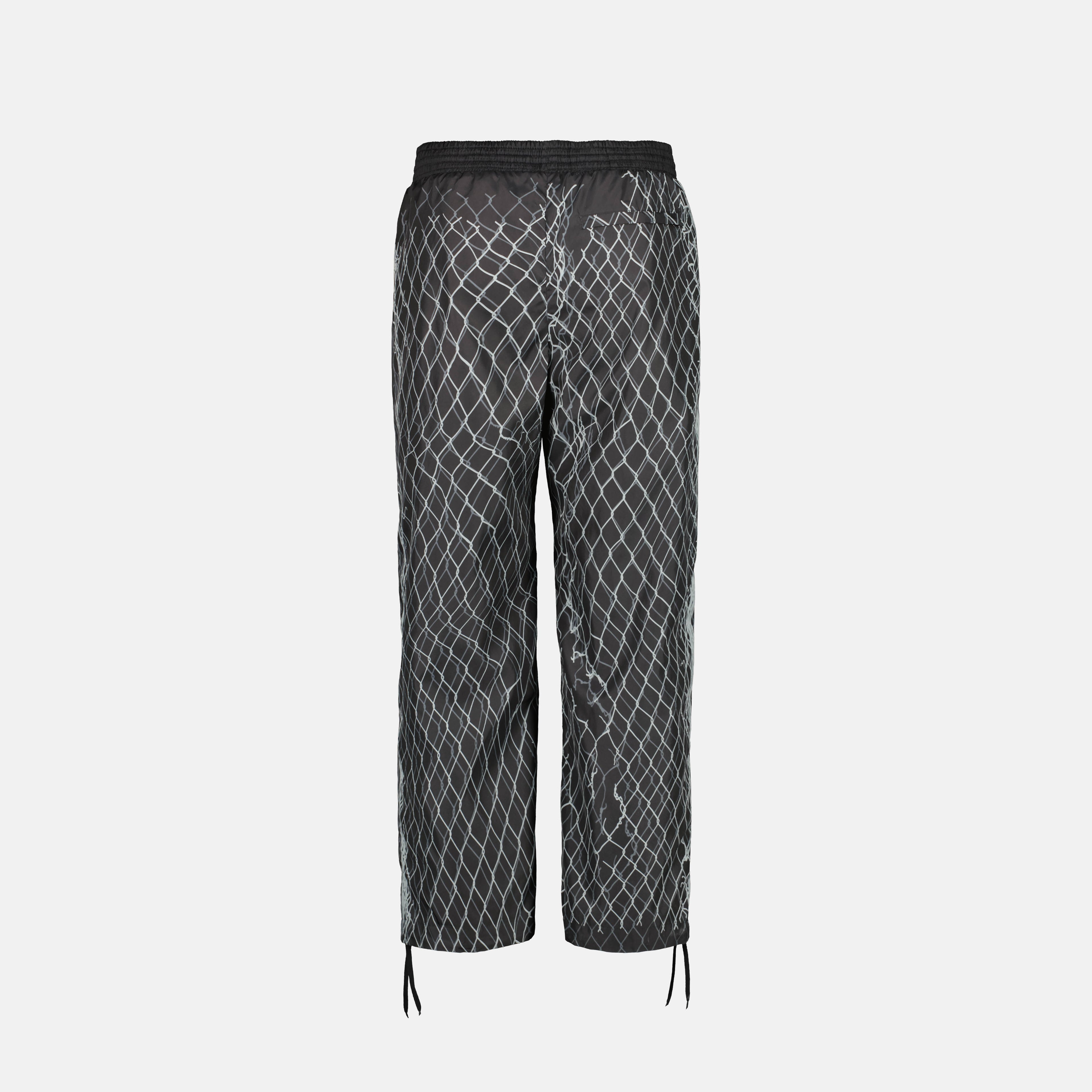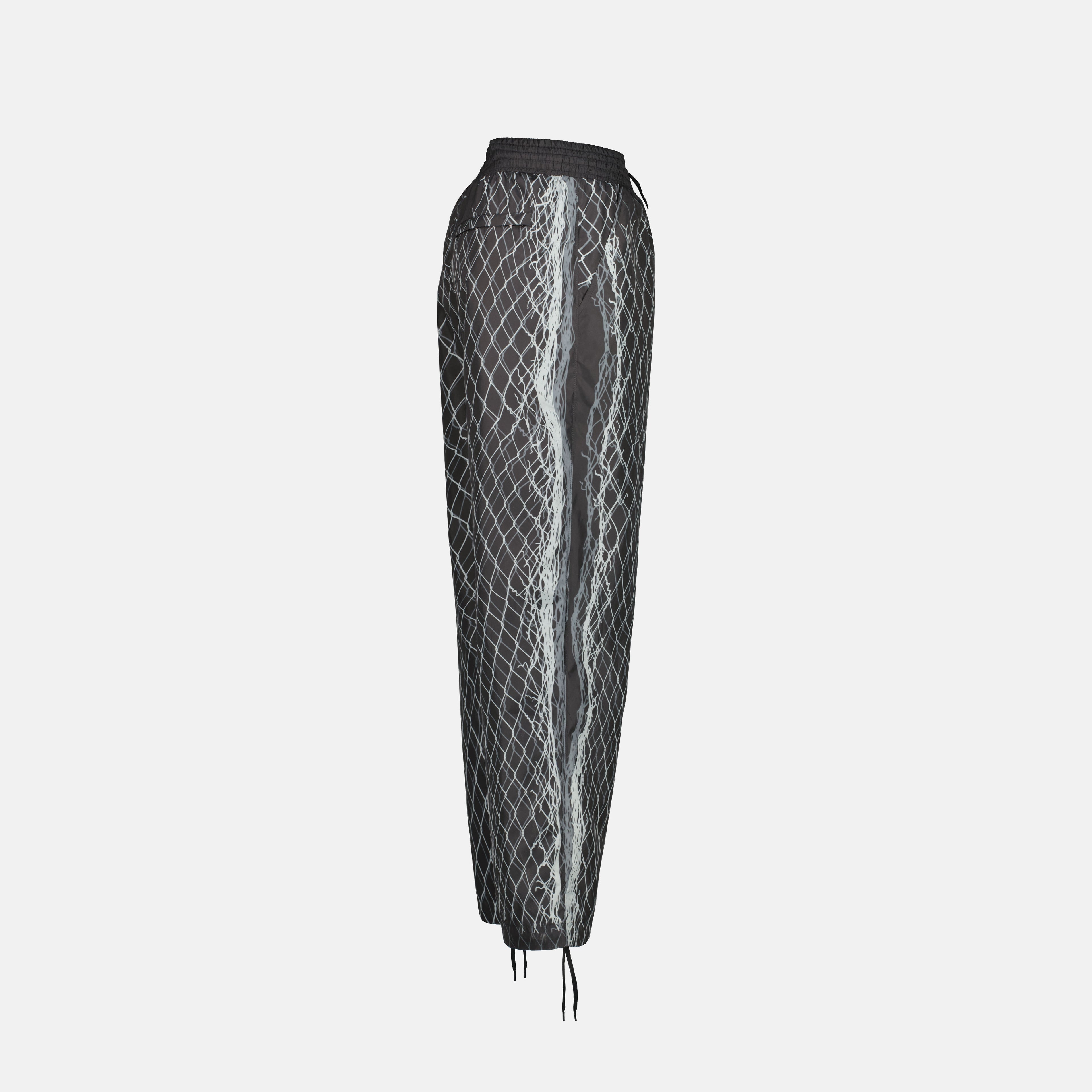 Nylon technical taffeta sweatpants with a mesh pattern print, cotton lining, elasticated waistband, and drawstring hem.