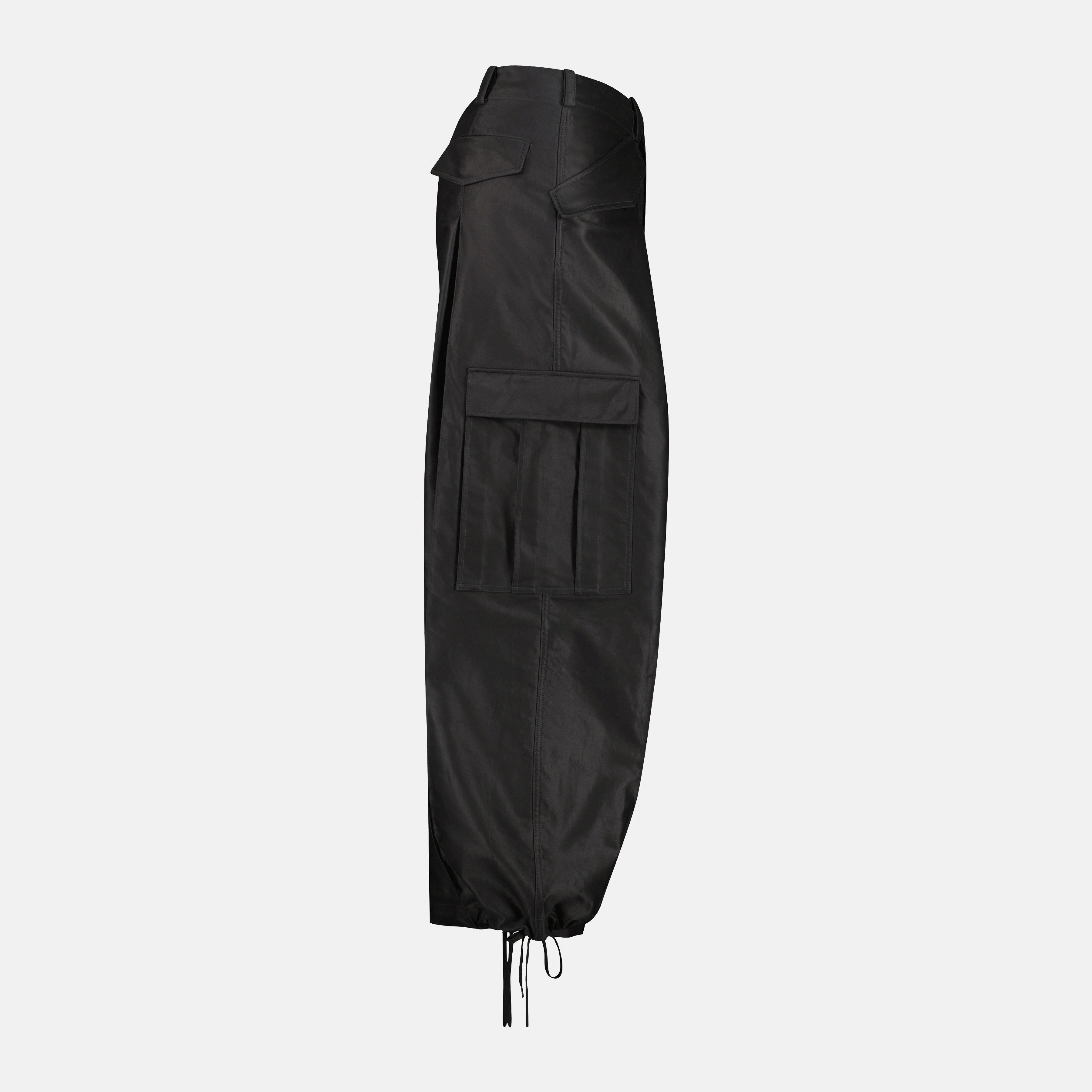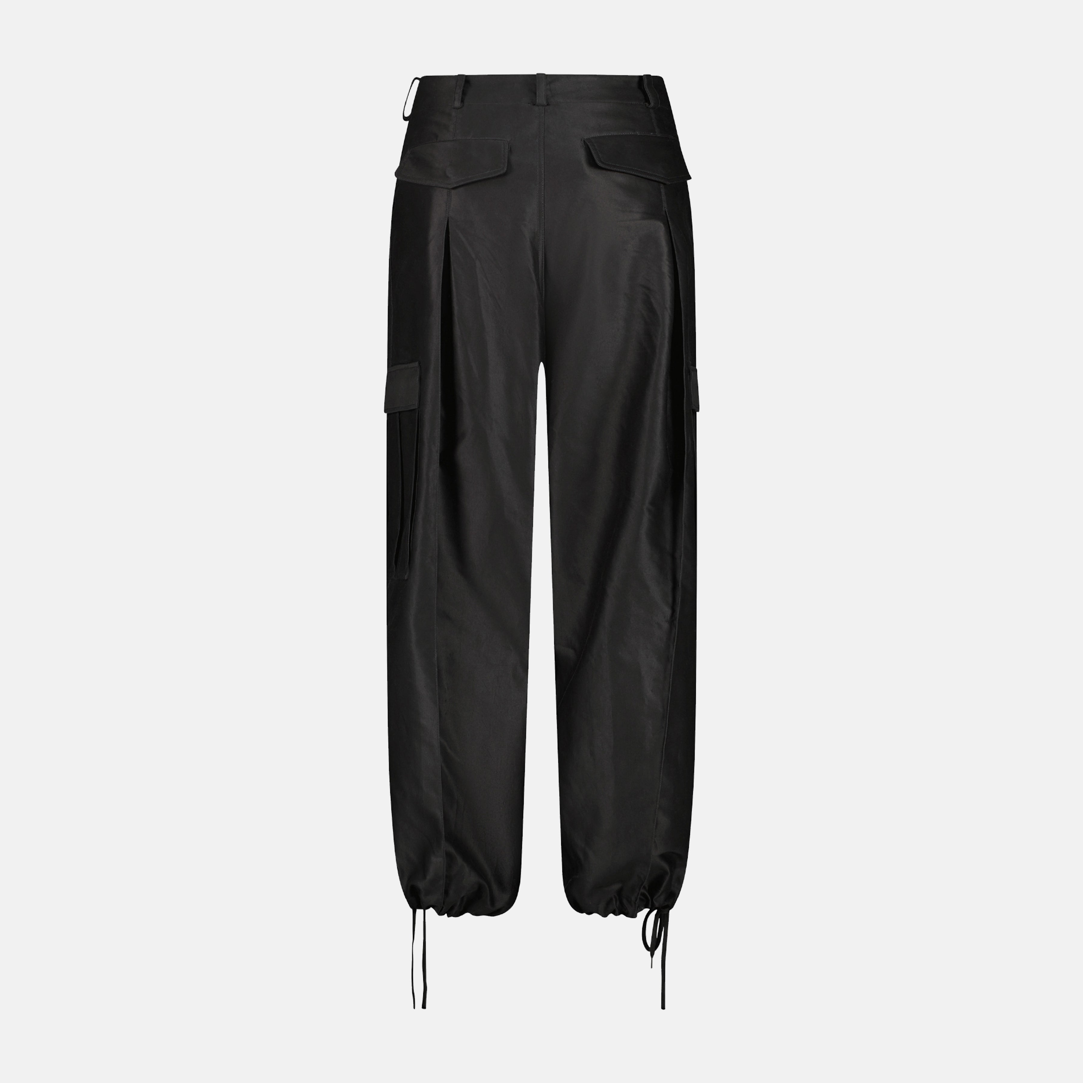 Pantalon cargo baggy à plis cousus devant et dos, poches à rabat devant et dos, poches latérales à rabat, ourlet avec coulisse et lacet. La largeur du bas de la jambe est de 29cm.