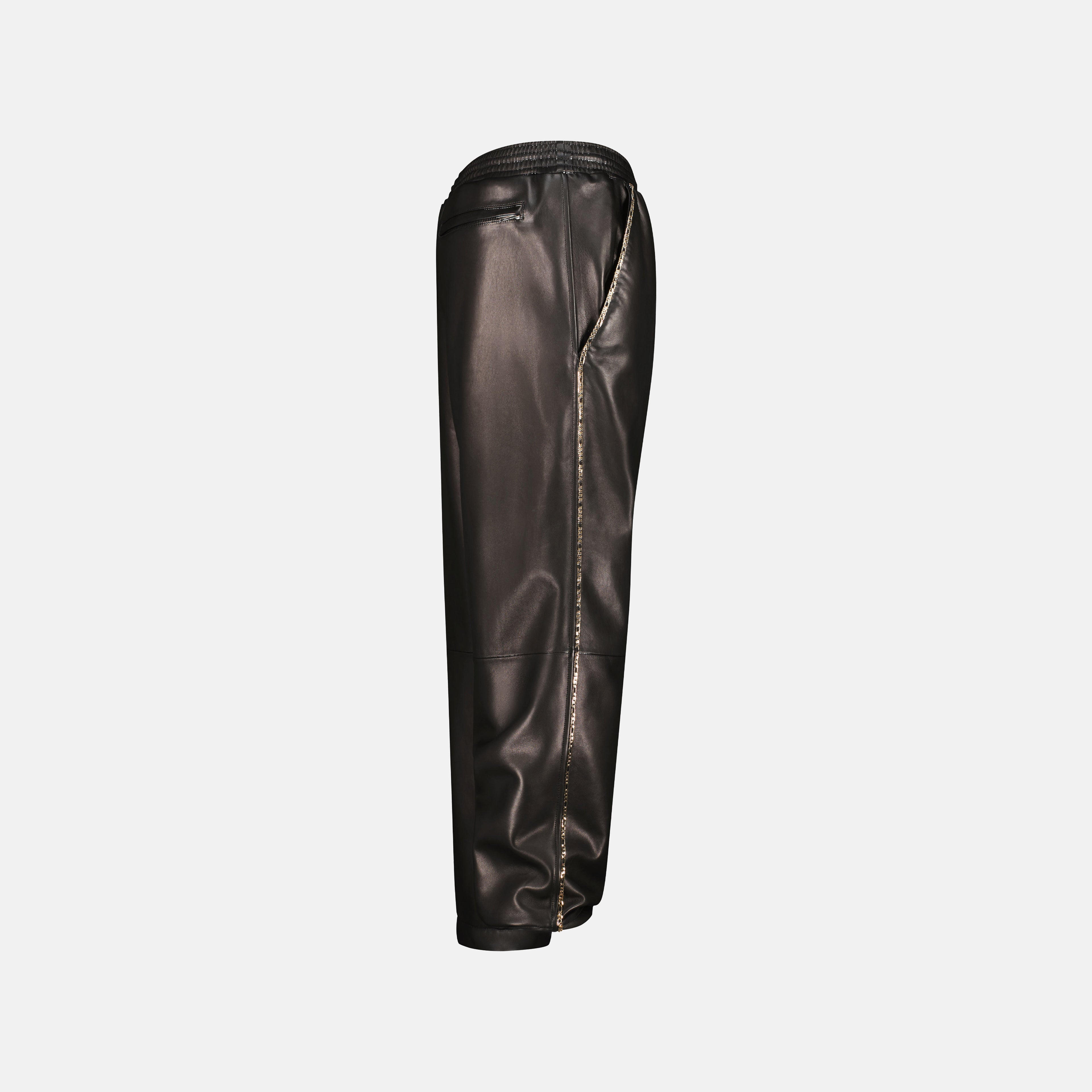 Pantalon de survêtement en cuir d’agneau plongé avec passepoil chaine dorée au côté et poches latérales, ceinture éla...
