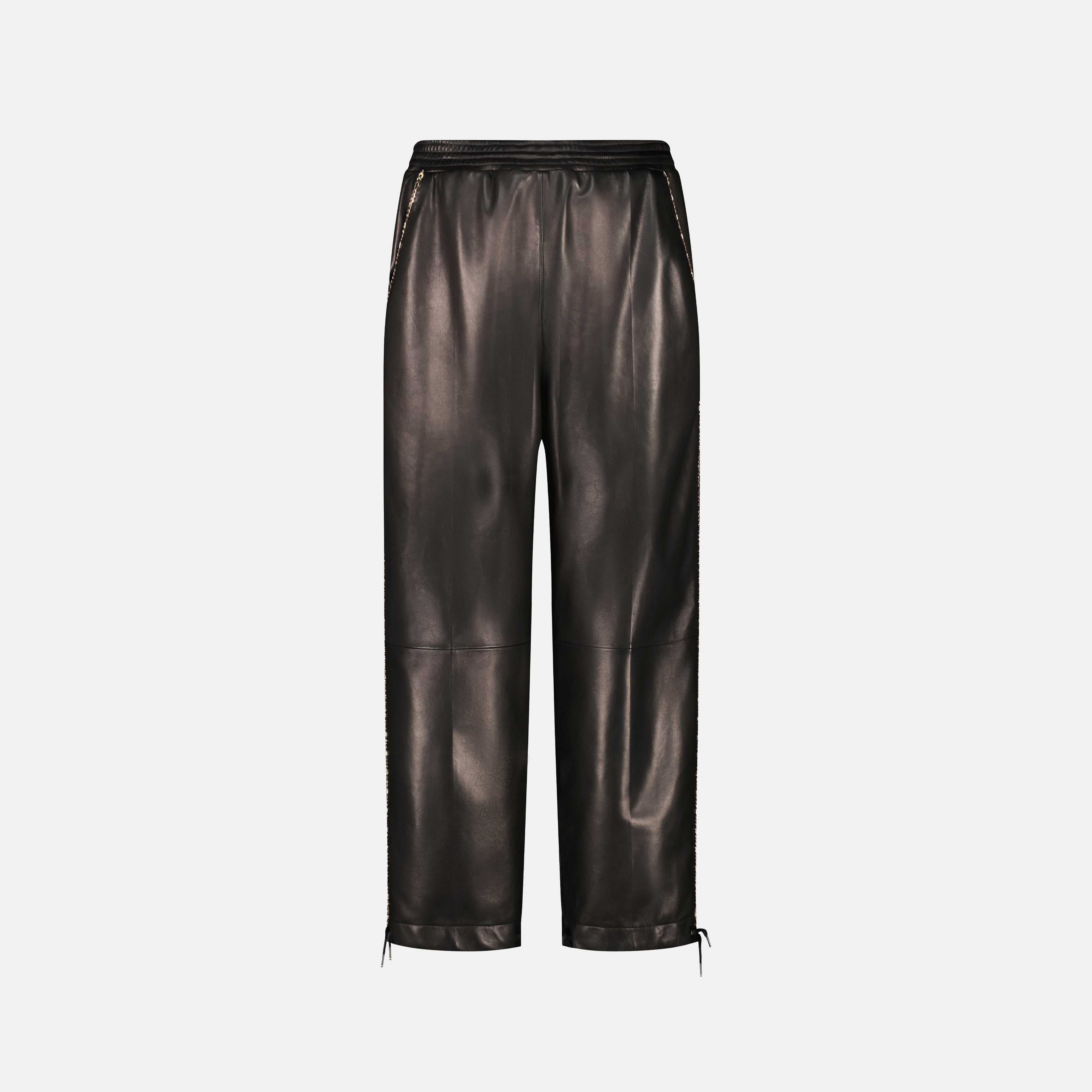Pantalon de survêtement en cuir d’agneau plongé avec passepoil chaine dorée au côté et poches latérales, ceinture élastiquée, ourlet coulissé. Doublé en coton.